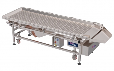 Machine destinée à la sélection vendage manuelle, vendange machine ou raisin égrappé. Le raisin avance grâce à la vibration du plan de travail obtenue par l’action combinée de motovibrateurs spéciaux. Le plan d’avancement du produit est perforé sur toute sa longueur de manière à assurer la séparation totale des corps étrangers tels que les pétioles, les tiges de feuilles, et tous ces corps ayant des dimensions telles qu’ils traversent la perforation supérieure.