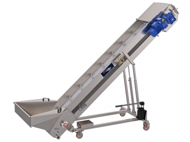 The belt structure is double in order to make the cleaning of the upper and lower stripes easier. Moreover, the elevator includes a scraper with recovering basin.