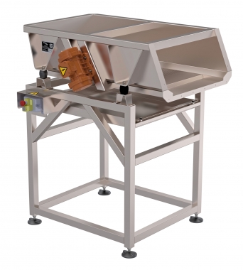 Posizionato prima del tavolo selezione, il TV1 permette di dosare e distribuire l'uva in maniera uniforme favorendo la cernita del prodotto. L'avanzamento dell'uva avviene grazie alla vibrazione del piano orizzontale, che essendo forato per metà della lunghezza, permette di recuperare il mosto in eccedenza ed effettuare una prima pulizia dell'uva.
